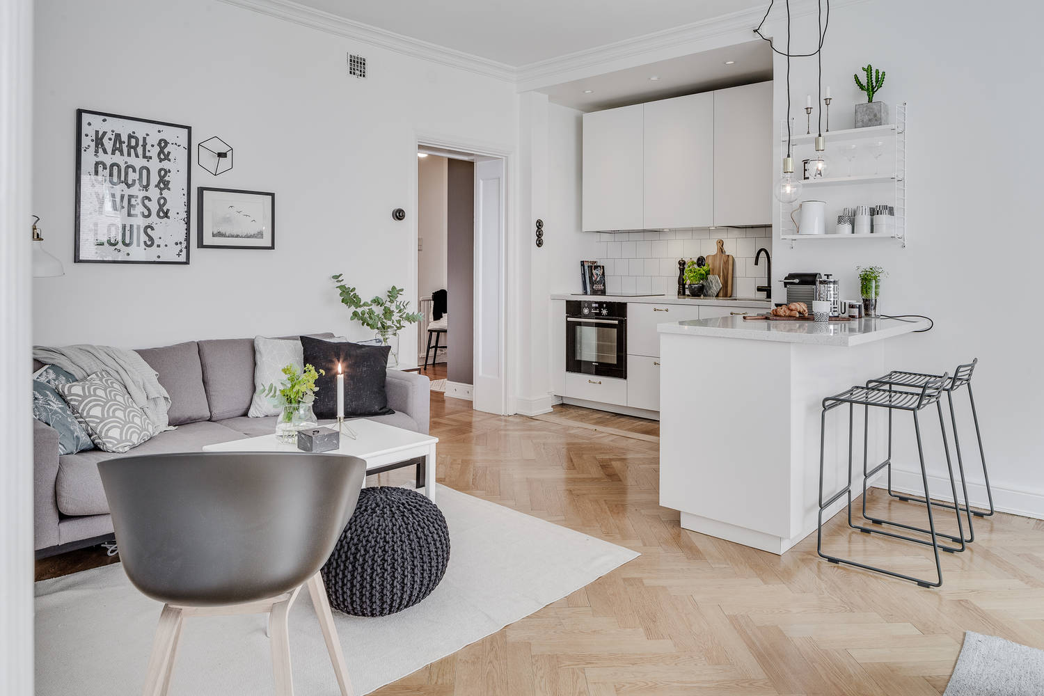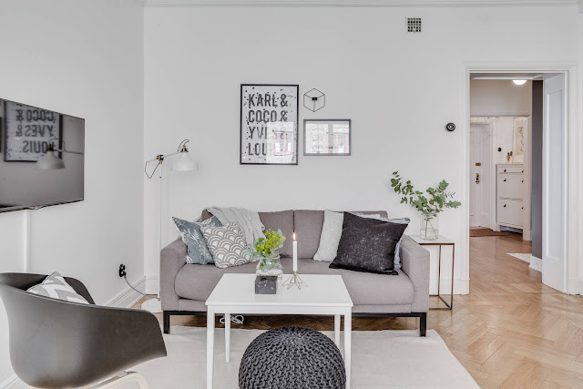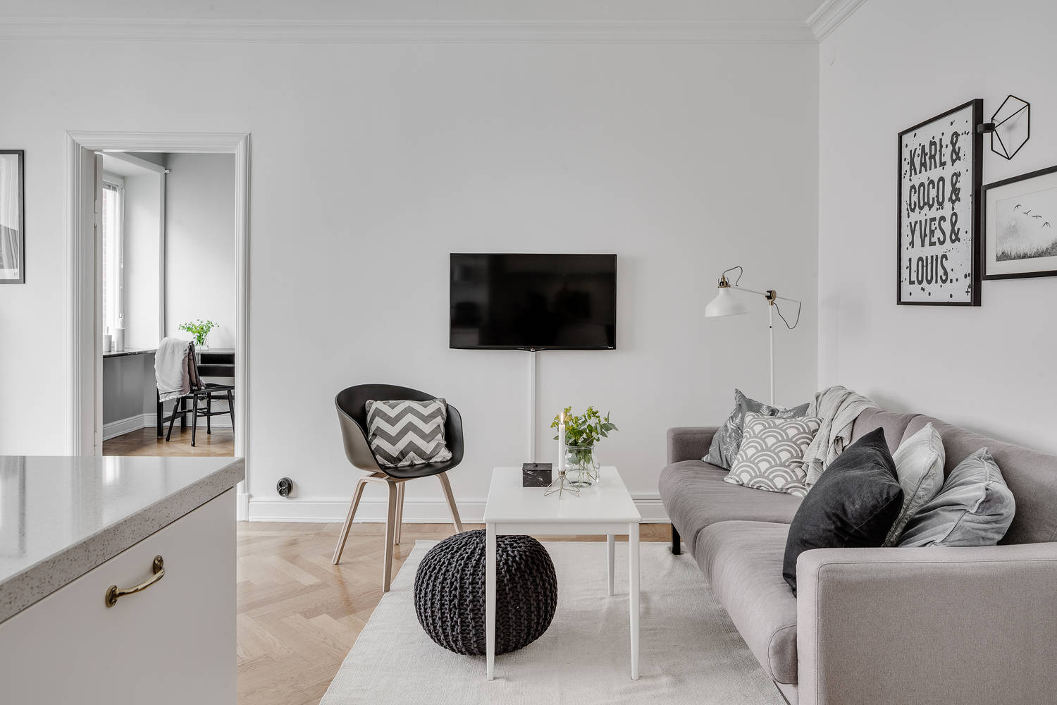Ta aranżacja to część dwupokojowego mieszkania o powierzchni ponad 50m2. Wnętrze jest jasne (białe ściany, białe szafki kuchenne), szara tekstylna sofa, fotel i modna pufa.