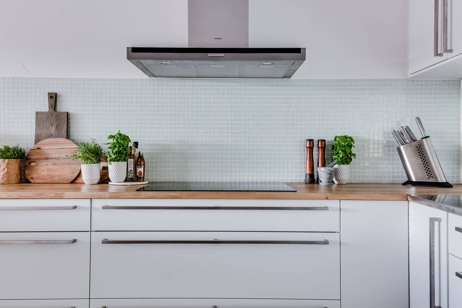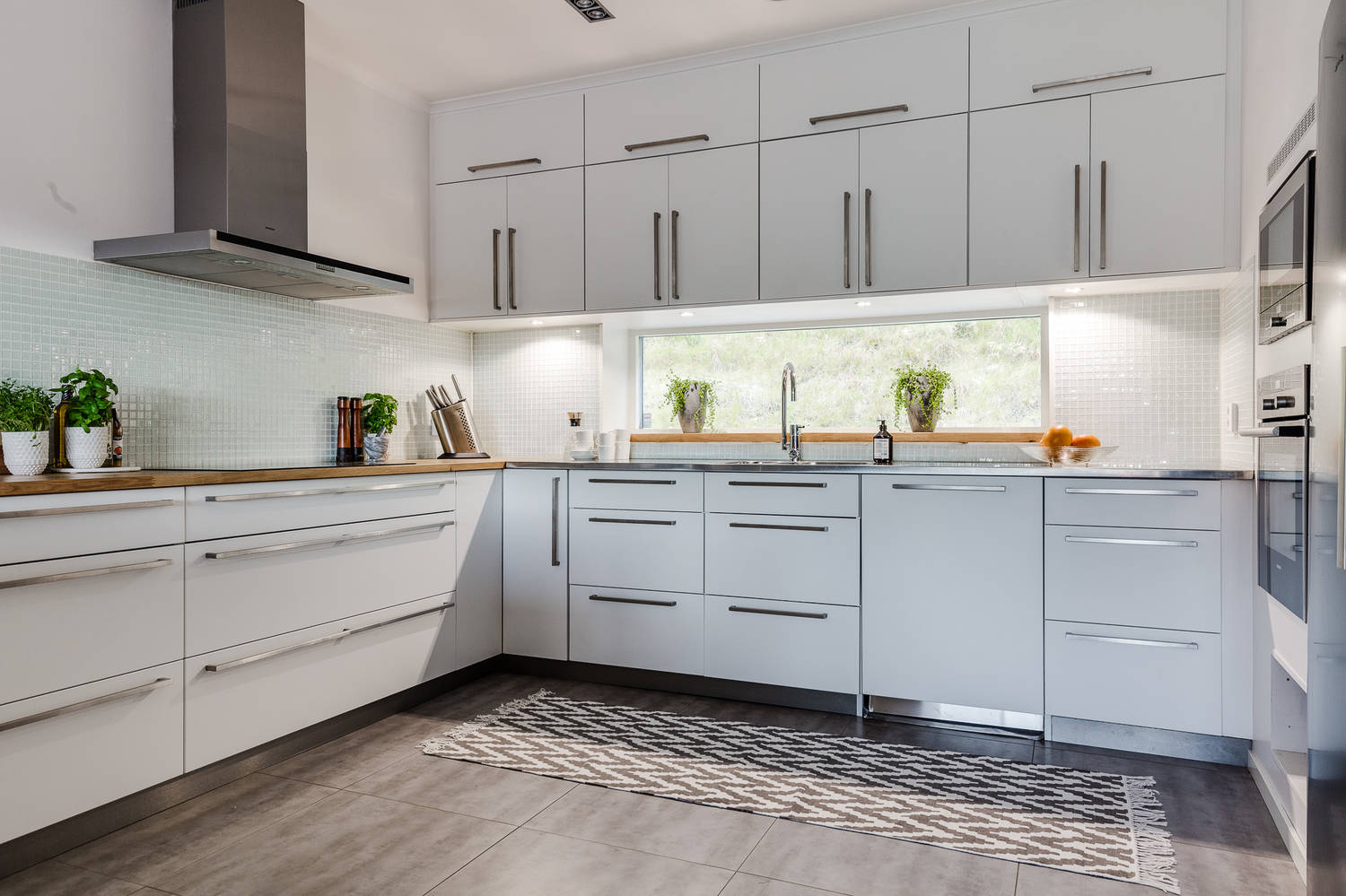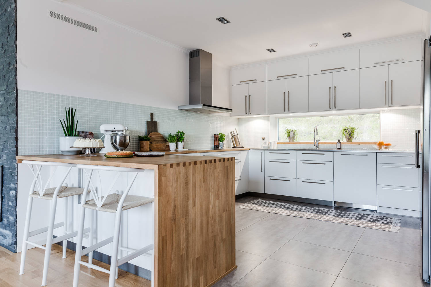 Dom może nie jest bardzo duży 90m2 – dwa poziomy, ale jasne stonowane kolory (białe ściany, drewniana podłoga, białe szafki kuchenne, szara sofa, szare zasłony, drewniany stół i białe krzesła) tworzą przytulną i przestronną przestrzeń!