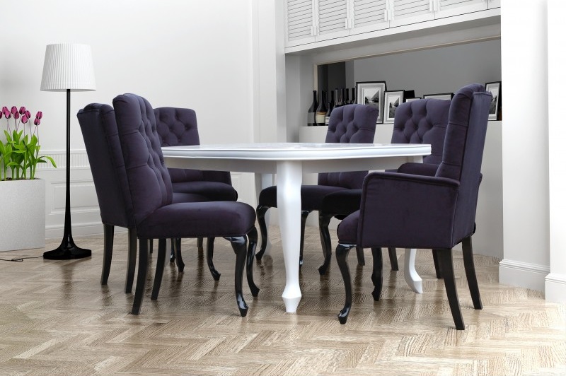 kolorze zieleni, granatu, fioletu, brązu czy nawet czerwieni), mebli w klasycznej formie lub zdobne