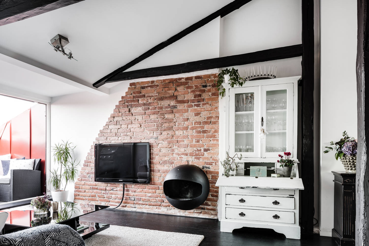 Salon z kuchnią i jadalnią położony na poddaszu. Białe ściany, jasne meble (w kuchni białe szafki, drewniany stół i tapicerowane krzesła, w części dziennej jasna sofa z miękkimi poduszkami, stylowa witryna) urozmaicone zostały odkrytą fakturą cegły oraz belkami konstrukcyjnymi pomalowanymi na ciemny kolor. Delikatnego koloru nadają także obrazki na ścianach.