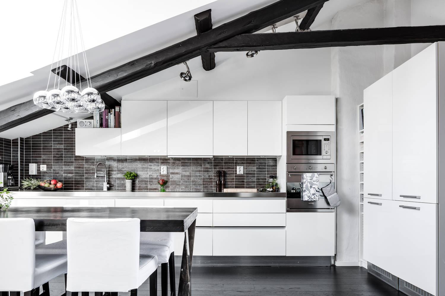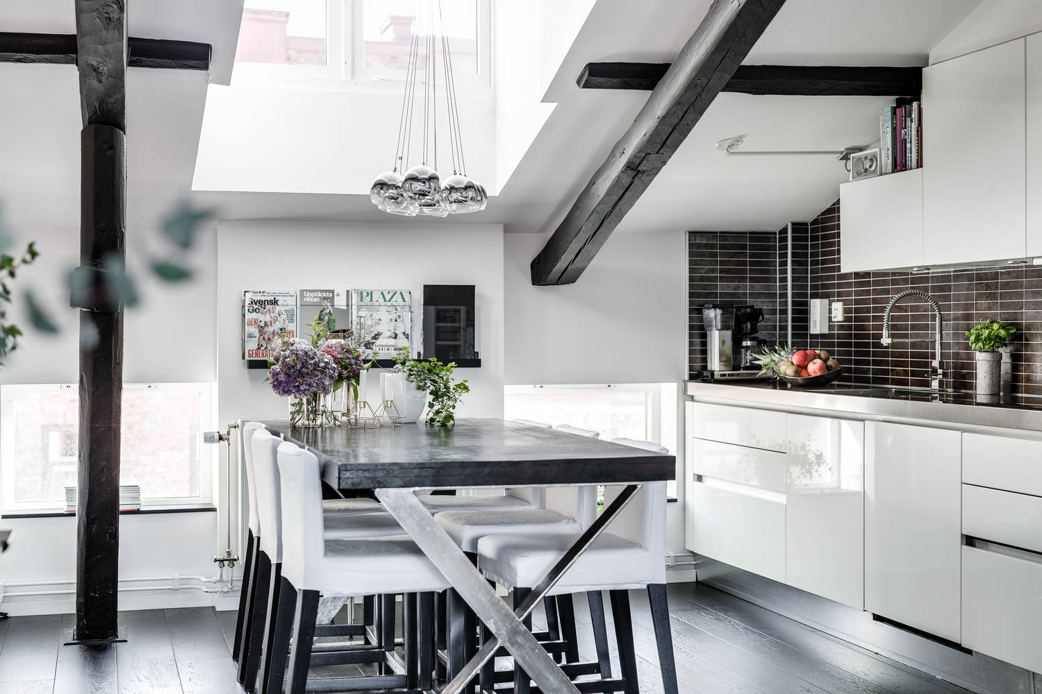 Duży stół ozdabiają tapicerowane krzesła oraz ciekawa lampa. Białe szafki kuchenne „odcinają” ciemne kafelki, które ładnie komponują się z ciemnymi belkami.
