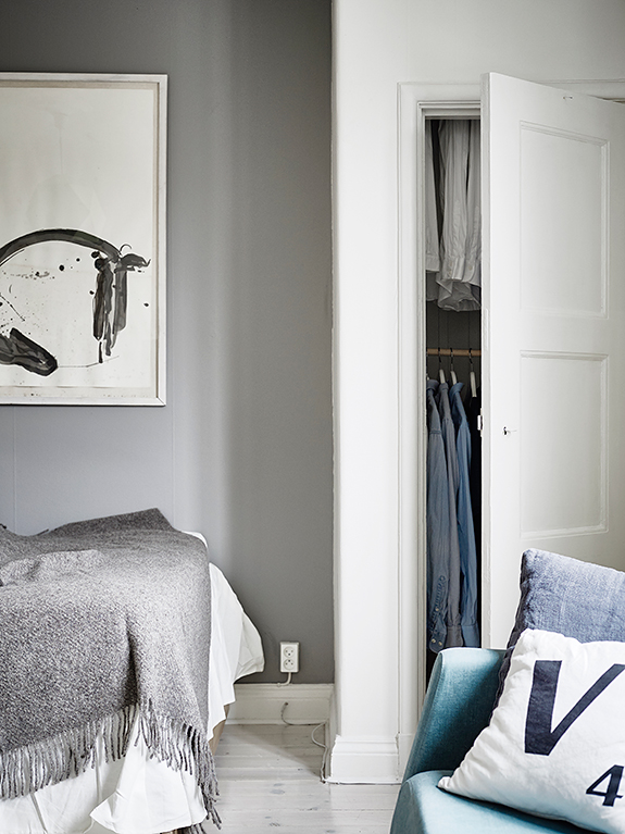 Pomieszczenie zdobi także oświetlenie w stylu skandynawskim, podobne można zobaczyć tutaj. W pokoju znalazło się także miejsce na zabudowaną szafę. Wiadomo, że miejsce do przechowyania w małym mieszkaniach jest bardzo istotne, bo obecność zbyt wielu przedmiotów „na wierzchu”, może stworzyć wrażenie bałaganu i optycznie pomniejszyć przestrzeń.