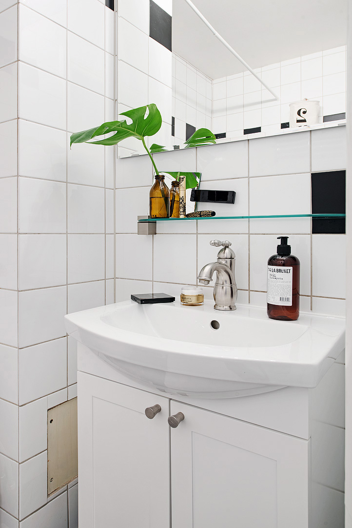Skandynawska kawalerka o powierzchni 40m2. Przestronny pokój dzienny z dużą narożną sofą. Z pokoju przechodzi się do kuchni, w której dominuje biały kolor. Sprytnie wyodrębniono tutaj także miejsce na sypialnię. Łazienka jasna, choć płytki wyglądają na takie z linii „basic”, postawiono na designerską wannę z nóżkami.