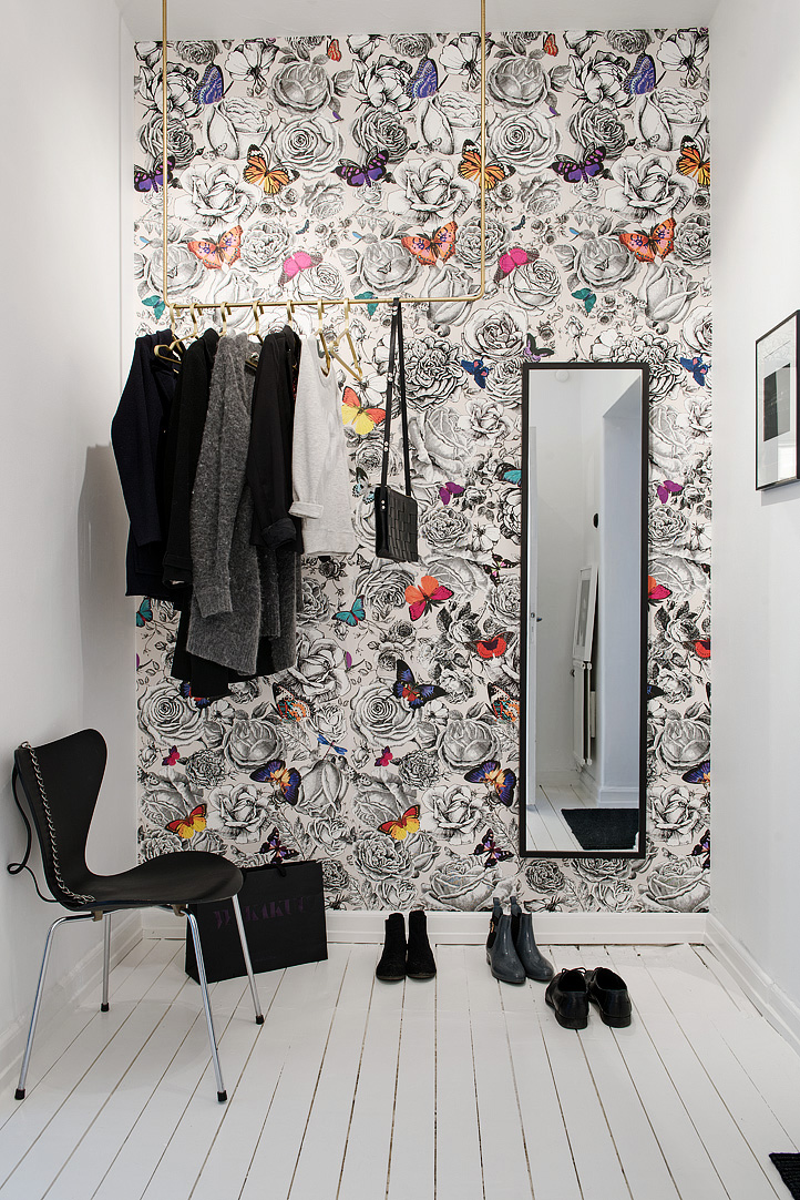 Wnętrze powiększają też lustra, ciekawą ozdobą jest skrzynia, na której poustawiano magazyny pewnie modowe) i zaskakujący żyrandol!