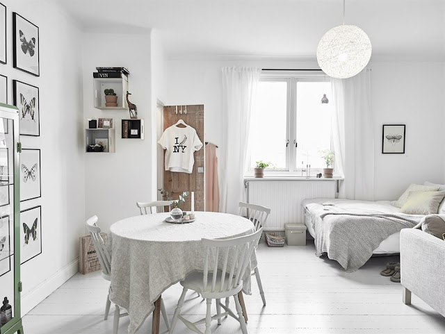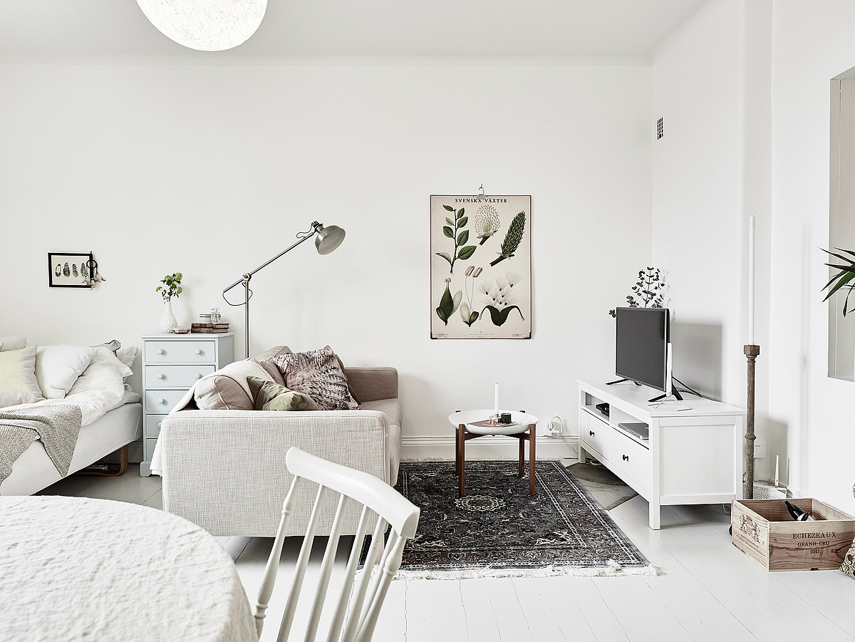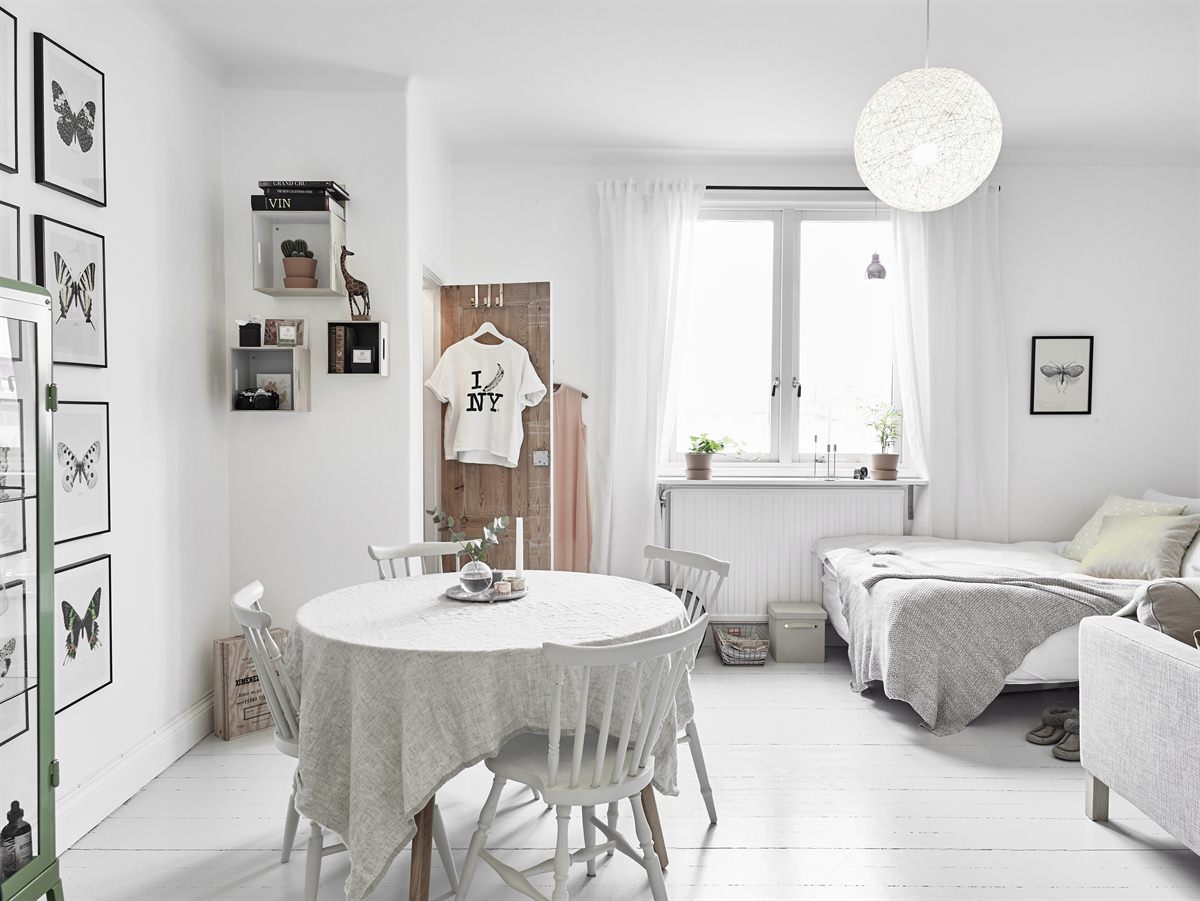 Skandynawska kawalerka czyli jednopokojowe mieszkanie urządzone w jasnej kolorystyce. Dominuje tutaj biel i to dzięki zastosowaniu stonowanych kolorów, bardzo przemyślanych dodatków oraz spójności stylistycznej stworzono wielofunkcyjny pokój (sypialnia, przestrzeń dzienna, jadalnia) bez wrażenia zagracenia wnętrza!