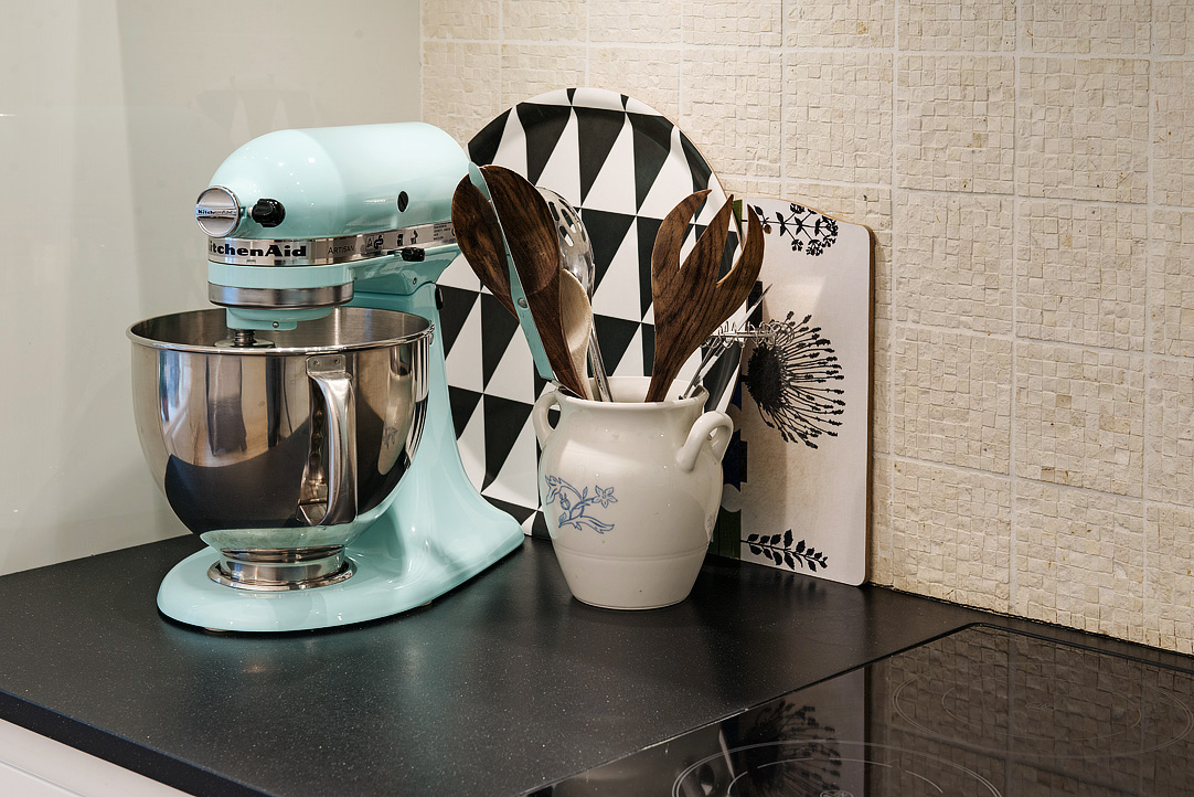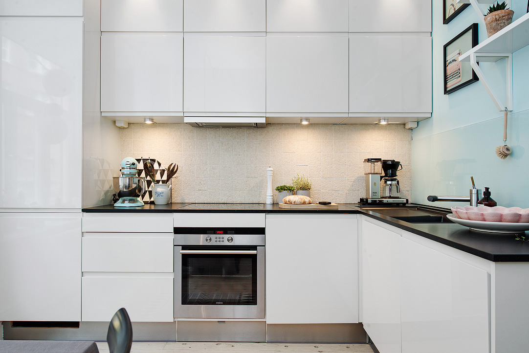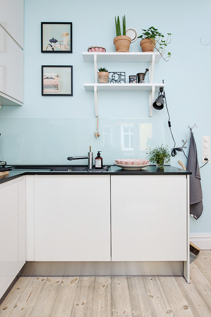 Przedstawiam dzisiaj skandynawską kuchnię. Jak to często bywa w takiej aranżacji szafki są koloru białego. Do tego pomalowano ściany na błękitny kolor, co wygląda wręcz cukierkowo! W kuchni zmieści się także stół i cztery krzesła.