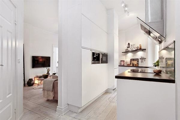 Aranżacja kolorystycznie podobna do ostatniej przedstawionej na blogu: biel, beż i czarne dodatki. Jasne wnętrze, urządzone w skandynawskim stylu. Trzy przestronne pokoje, charakter otwartego wnętrza, mimo podziału na strefy ograniczono liczbę ścian i drzwi.