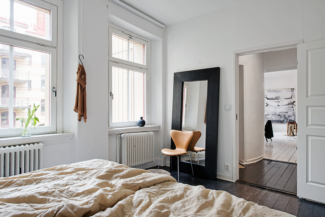 W sypialni duże łóżko, na nim pościel z naturalnego materiału, lustro postawione na podłodze. Podłoga drewniana, malowana na czarny kolor. Przestronna garderoba oraz łazienka w szarościach.