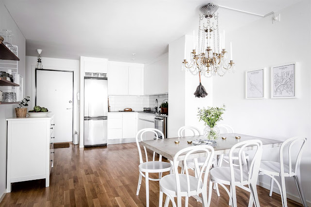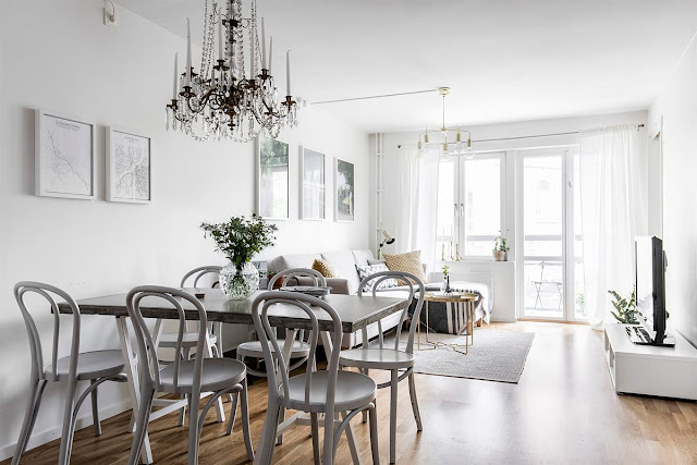 Co wyróżnia to mieszkanie? Z pewnością kryształowy żyrandol nad stołem. Wiele elementów jest charakterystycznych dla skandynawskiego stylu, tj. jasne kolory, tkaniny, starannie dobrane dodatki w minimalistycznej formie i liczbie.