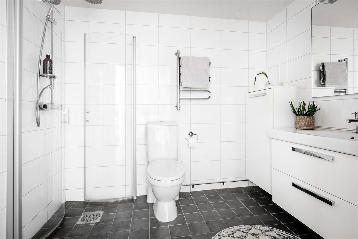 Łazienka to głównie białe i szare płytki oraz niezbędne wyposażenie tego miejsca, takie jak kabina prysznicowa, toaleta, umywalka wraz z szafką.
