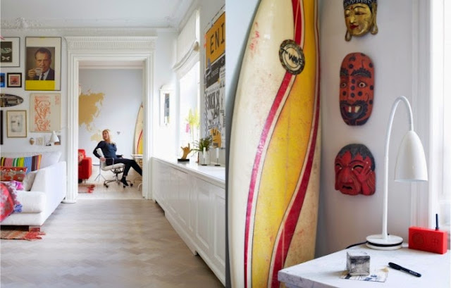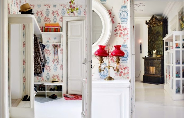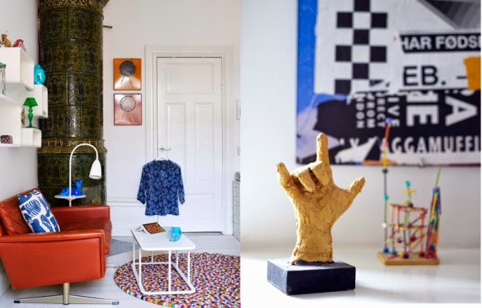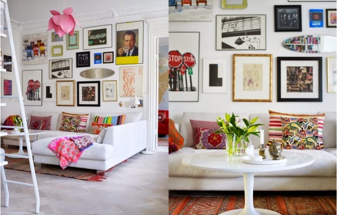 Skandynawskie wnętrze już było wczoraj na blogu, dziś również, ale jest coś co te dwie aranżacje różni. To liczba dodatków!  Tutaj jest ich pełno, różnokolorowe przedmioty poukładane na stoliku, półkach, zawieszone na ścianach. Baza: podłoga, ściany (oprócz tapety) w białym kolorze.