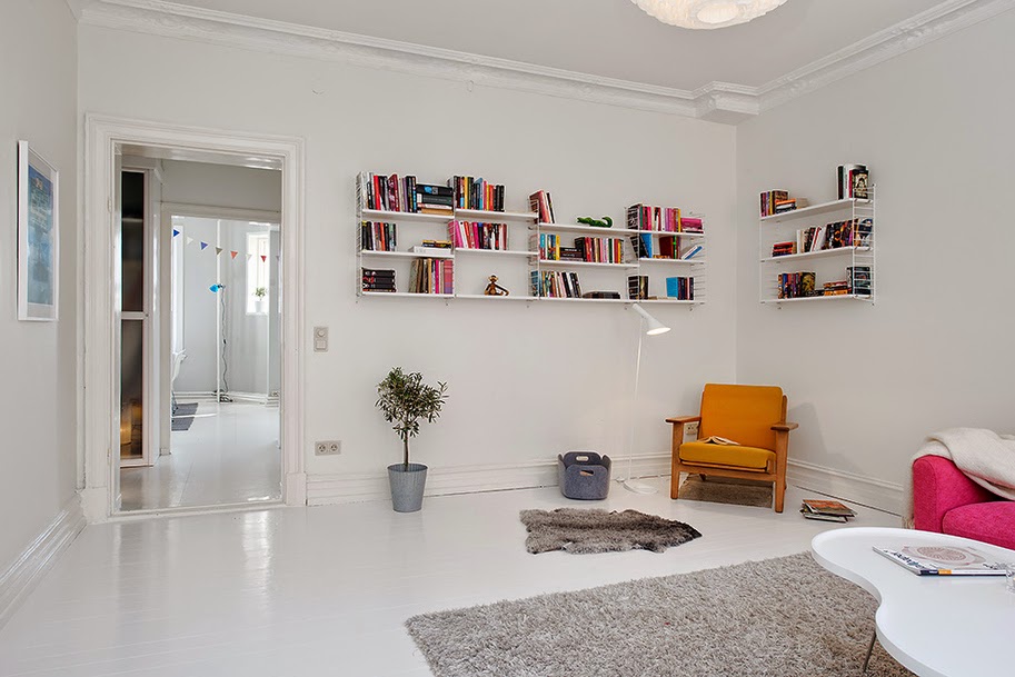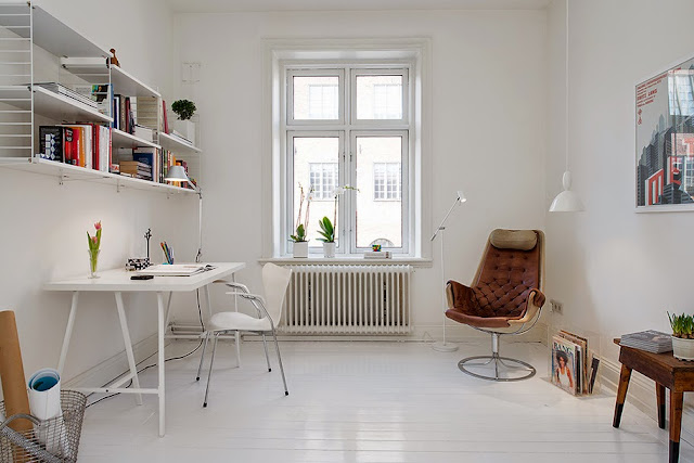Mieszkanie urządzone w stylu skandynawskim. Wnętrze ma aż 104m2, jednak nie za dużo pomieszczeń. Dzięki temu każdy pokój jest przestronny i jasny. Mamy tutaj salon, kuchnię z jadalnią, sypialnię, łazienkę i pracownię. Mieszkanie położone jest na czwartym piętrze budynku, co daje możliwość podziwiania ładnego widoku zza okna. Pokoje są przechodnie, widzimy jednego mieszkańca na zdjęciach i wygląda na zadowolonego 🙂