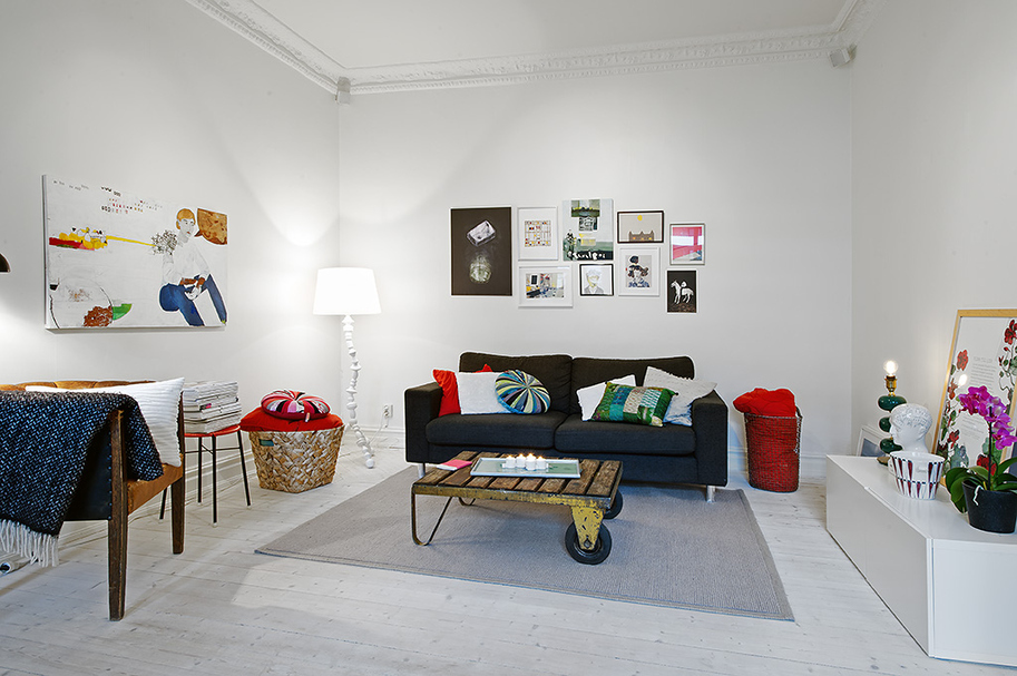 Aranżacja jasna, w większości pomieszczeń białe ściany i jasna podłoga, tylko w pokoju dziecka miętowe. W sypialni zorganizowano także domowe biuro. Kolor (jak to w mieszkaniach urządzonych w skandynawskim stylu) wprowadzają dodatki. W kuch białe szafki, srebrna lodówka i żółte krzesła.
