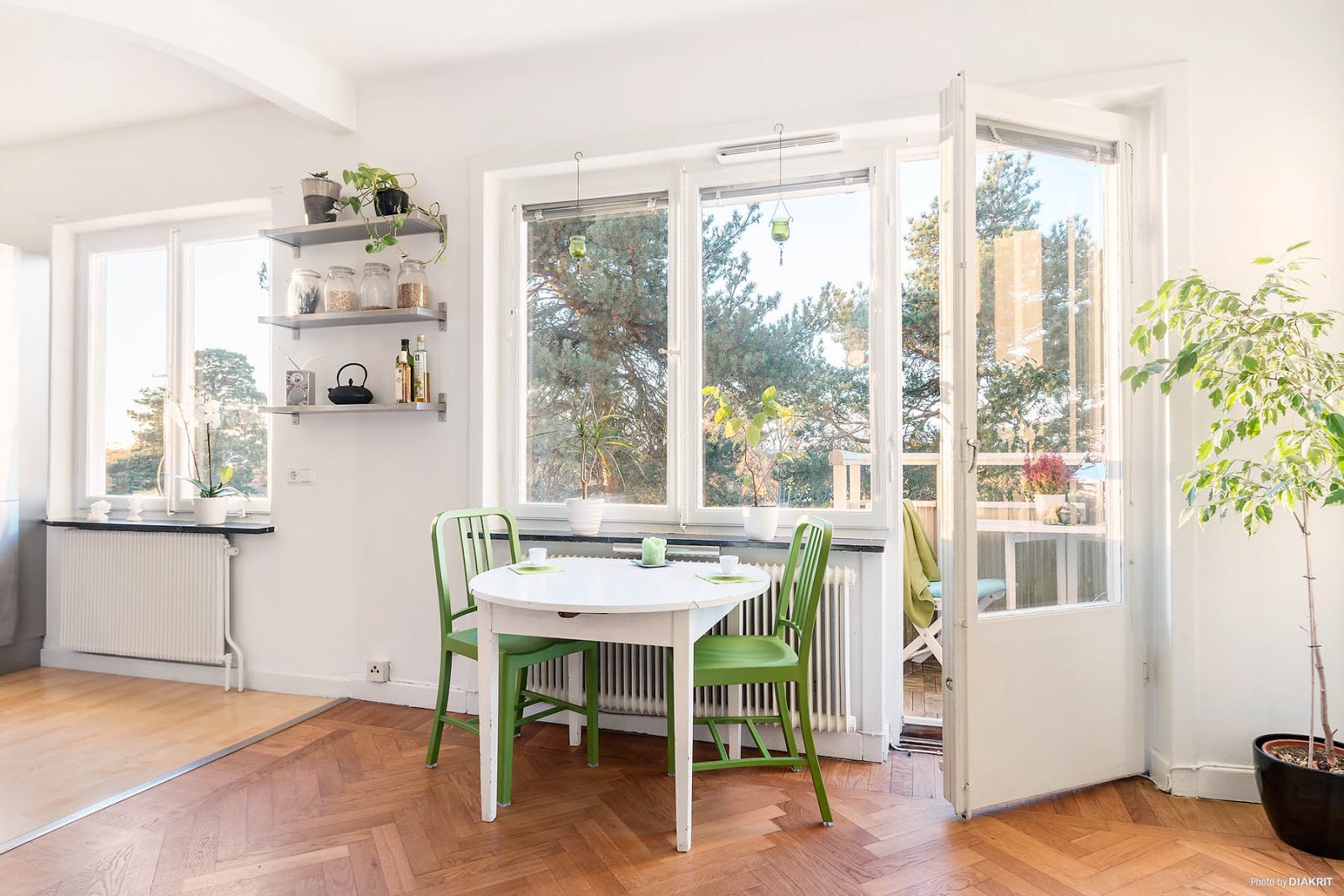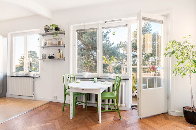 Skandynawskie mieszkanie w bloku o powierzchni 46m2. Wnętrze składa się z pokoju dziennego, z którego przechodzi się do kuchni i sypialni, łazienki i korytarza. Taki rozkład widziałam w mieszkaniach w blokach z lat 70-tych.
