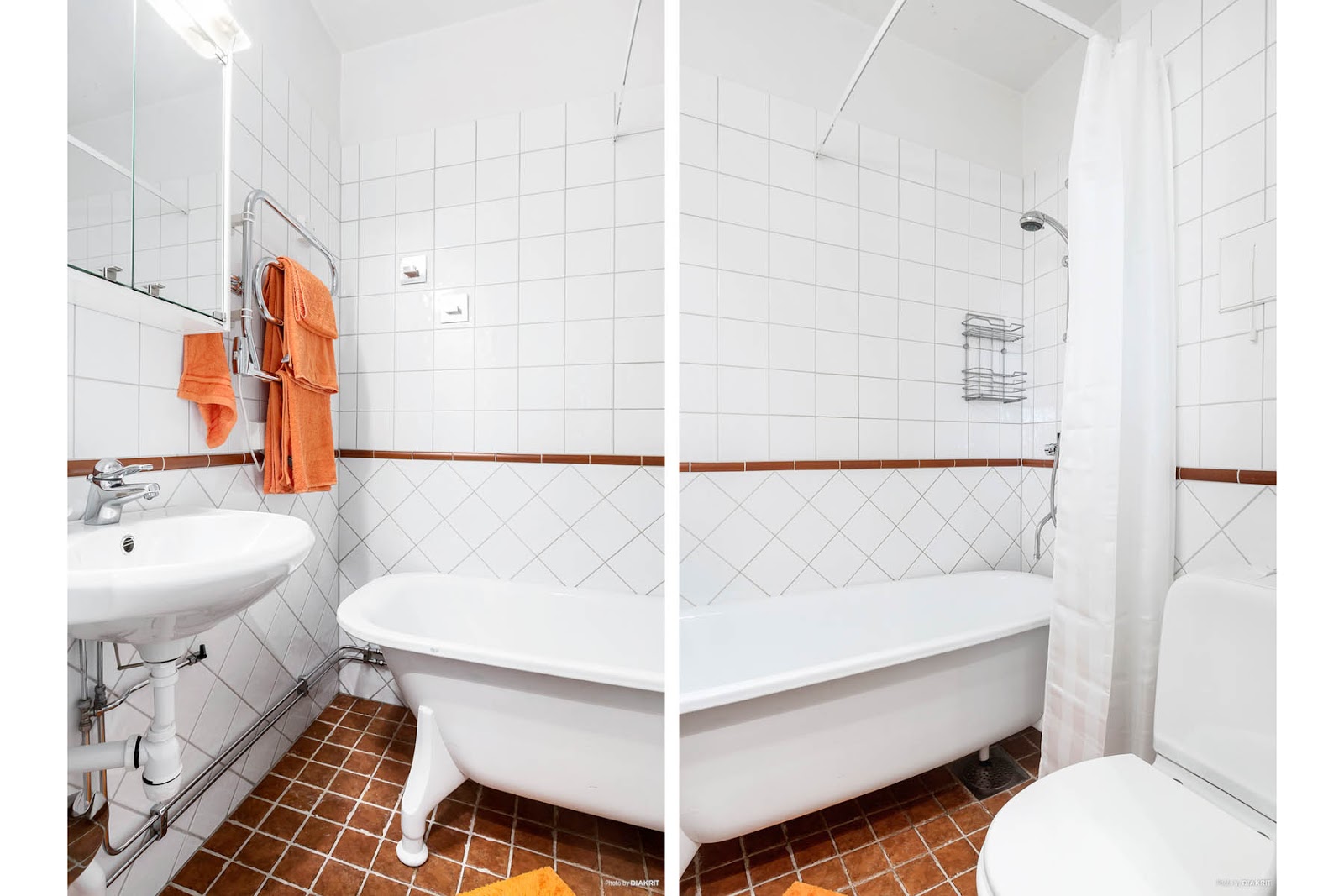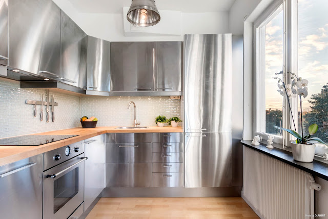 W pokoju dziennym białe ściany, drewniana podłoga, szara sofa oraz kominek (to akurat rzadkość w mieszkaniach położonych w blokach). Kuchnia z metalicznymi szafkami, coraz bardziej popularnymi, choć kiedyś taki kuchenny design gościł raczej w kuchniach przemysłowych. Szafki zostały „ocieplone” drewnianym blatem oraz panelami na podłodze. W sypialni zmieściło się łóżko, komoda oraz szafka. Ozdobą wnętrza jest także narożne okno. Łazienka w płytkach wyglądających raczej na „niższą półkę”, za to korytarz mimo minimalizmu wygląda na przytulny i jasny. Do mieszkania przynależy także niewielki balkon.