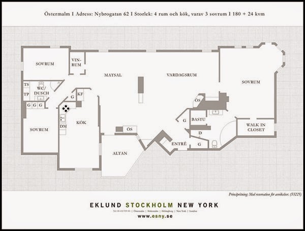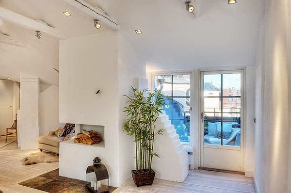 Mieszkanie znajduje się w Szwecji. Jest wykończone z użyciem naturalnych materiałów: dużo drewna, tkanin i szkła. Jest umiejscowione na ostatnim piętrze budynku, co gwarantuje anonimowość na tarasie. Wyeksponowane zostały piękne drewniane belki na suficie. Wnętrze ma charakter otwarty, przestrzeń została wyodrębniona (strefa dzienna, jadalna, sypialnia), ale ograniczono liczbę drzwi.