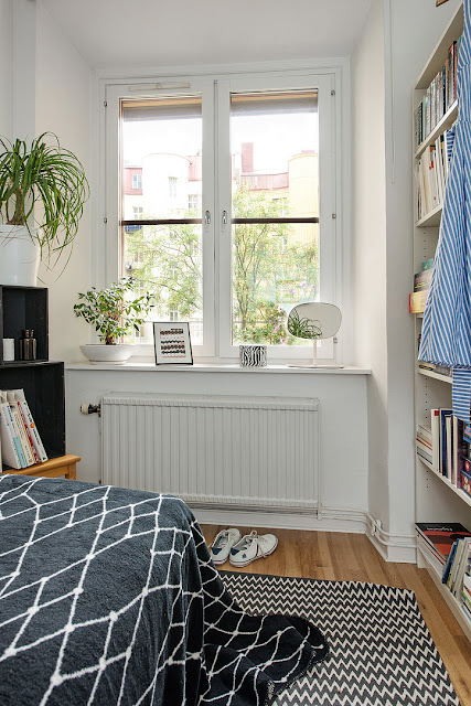 Kolejna sypialnia wygląda jak pokój nastolatki lub gościnny. Dużą część przestrzeni zajmuje łóżko, wypełniają ją regały z książkami.