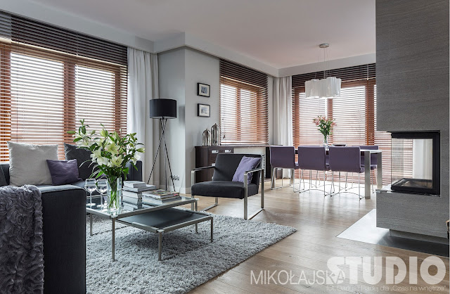 Może spodoba Wam się ta aranżacja domu pod Krakowem projektu Mikołajska Studio? Uwagę przykuwa duża przestrzeń dzienna: tekstylna sofa, kominek, duży stół jadalny, oświetlenie (stojąca lampa i żyrandol), a także starannie dobrane dodatki i elementy wykończenia (takie jak: ukryte karnisze, srebrne wazoniki, oświetlenie obrazów). Z salonu (przez jadalnię) przechodzi się do przestronnej kuchni.
