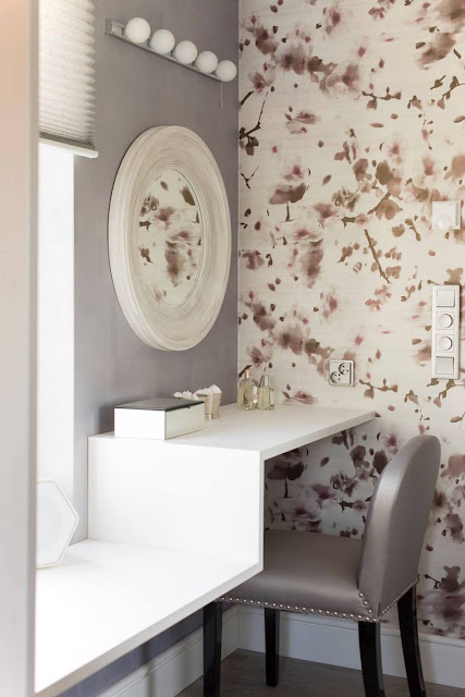 Wnętrze w stylu glamour, jednak z przewagą jasnych kolorów: beż, srebro i szarość. Dzisiaj wybrałam inną aranżacje niż skandynawski styl z uwagi na to, że niektórzy z Was zarzucają, że mieszkając we wnętrzu urządzonym w skandynawskim stylu „murowana ostra depresja i myśli samobójcze”.