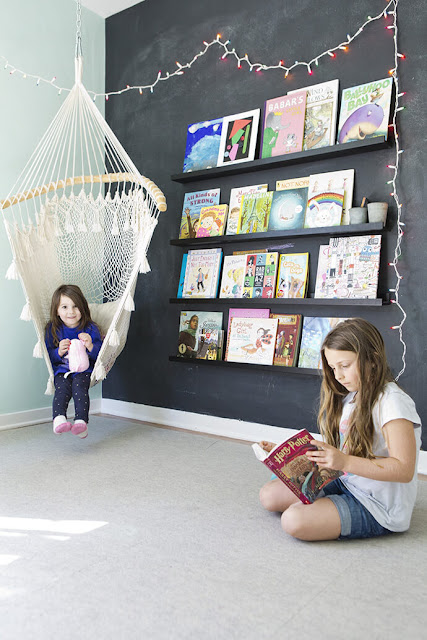 Pokój dziewczynek to piętrowe łóżko, a także cała ściana z wyeksponowanymi książeczkami na półkach (bardzo popularne rozwiązanie w amerykańskich aranżacjach wnętrz) i bujak – hamak. Dzieci w pewnym wieku powinny nawet dzielić pokój, bo dzięki wspólnym zabawom szybciej się rozwijają. Co więcej jest nawet pokój do wspólnego malowania, aby uniknąć „roznoszenia” i brudzenia farbą po całym domu z nie do końca wyschniętych prac.